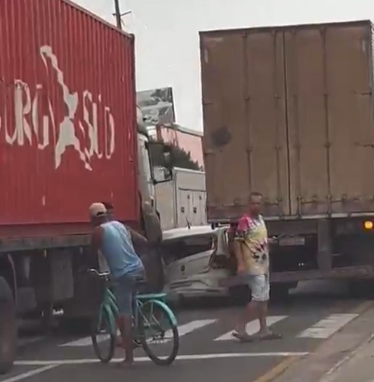De acordo com as primeiras informações, a colisão ocorreu no início da manhã, em um trecho de grande movimentação escolar e comercial. O carro de passeio acabou ficando prensado ou atingido pelos veículos de carga, embora ainda não haja detalhes sobre a dinâmica exata da batida ou o estado de saúde dos ocupantes.