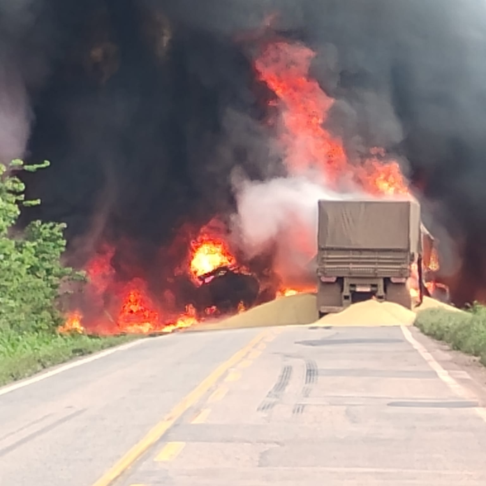 De acordo com informações preliminares, o motorista de um caminhão-tanque conseguiu se salvar e foi socorrido, sendo encaminhado para atendimento médico no município de Tailândia.