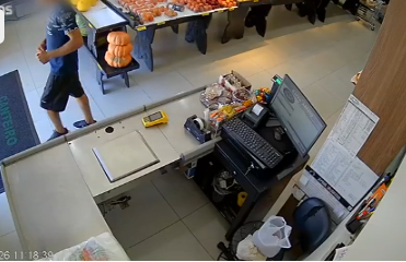 • 11h18: O homem se aproxima do caixa, pega o celular que estava sobre o balcão e sai da loja sem ser notado.