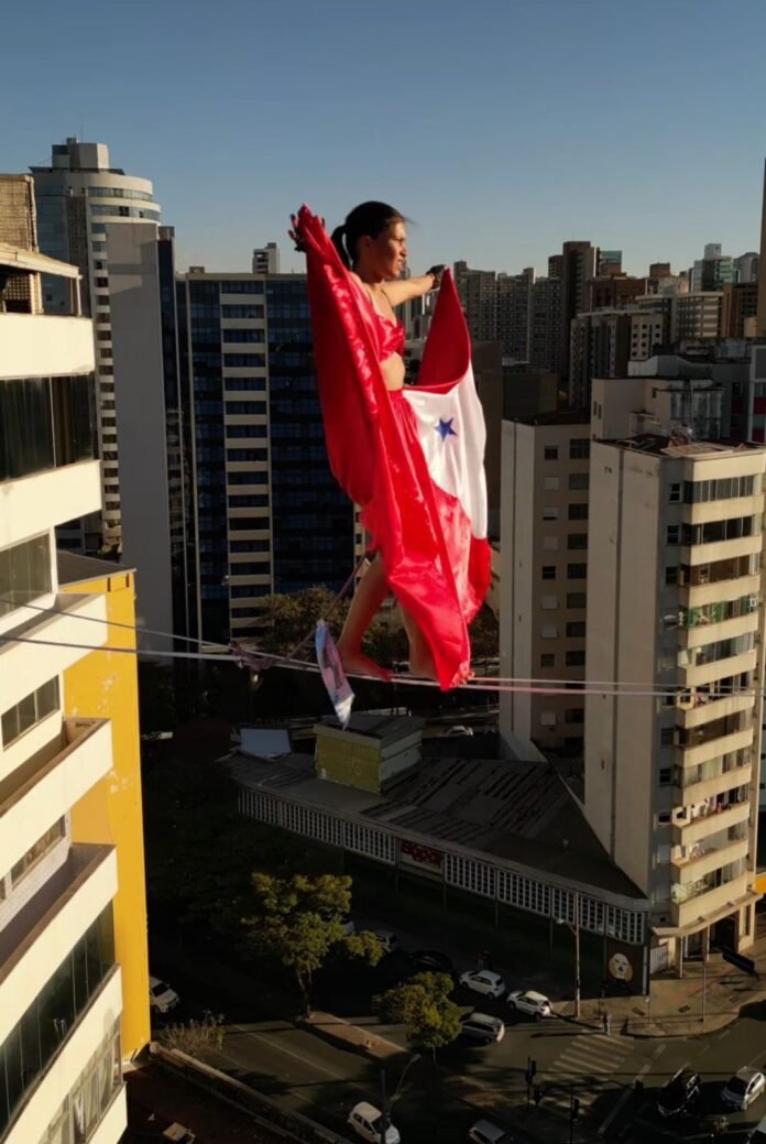 “Usando uma saia típica de carimbó, a atleta de Anapu completou uma travessia de 229 metros entre dois prédios, celebrando a cultura e as cores do Pará durante o desafio.”