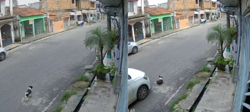 Câmeras de segurança registraram o momento em que o veículo passa sobre o animal, que estava deitado na pista. O condutor não parou para prestar socorro e deixou o local.