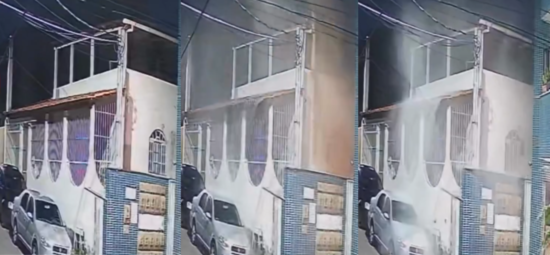 Uma câmera de segurança registrou o momento em que pedaços de concreto se desprendem da estrutura e caem na rua por volta das 4h48. Os destroços atingiram o asfalto e imóveis próximos.