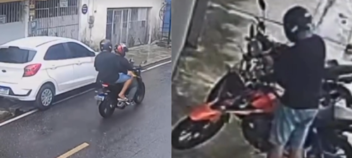 Imagens de câmeras de segurança flagraram dois homens em uma motocicleta circulando pelas ruas do bairro da Sacramenta, em Belém.