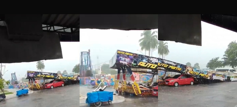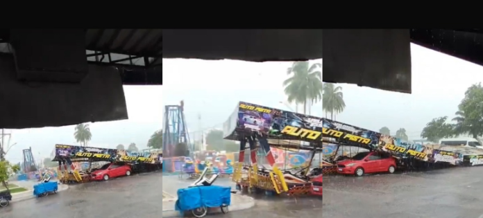 Um acidente assustou frequentadores da praça principal de Marituba, na Região Metropolitana de Belém, na tarde desta terça-feira (13). Um caminhão baú, ao realizar uma manobra ou trafegar próximo às estruturas de um parque de diversões instalado no local, acabou colidindo contra o brinquedo conhecido como “auto pista” (ou tromba-tromba).