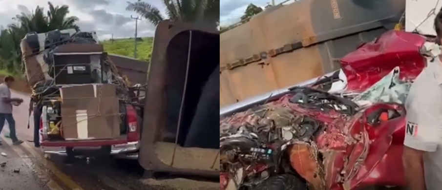 A colisão envolveu um caminhão rodocaçamba e uma caminhonete modelo Toyota Hilux, resultando em uma cena de grande destruição.