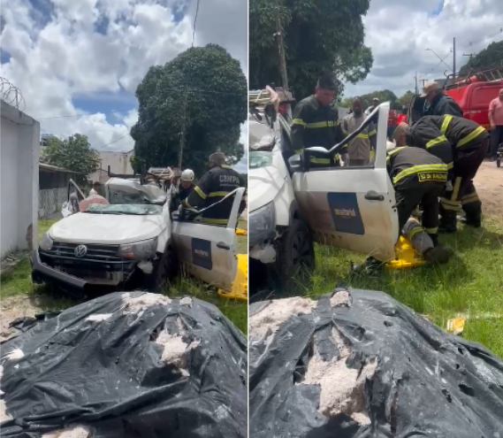 Imagens compartilhadas mostram o carro com a parte frontal danificada, além da presença de equipes de atendimento prestando apoio no local.