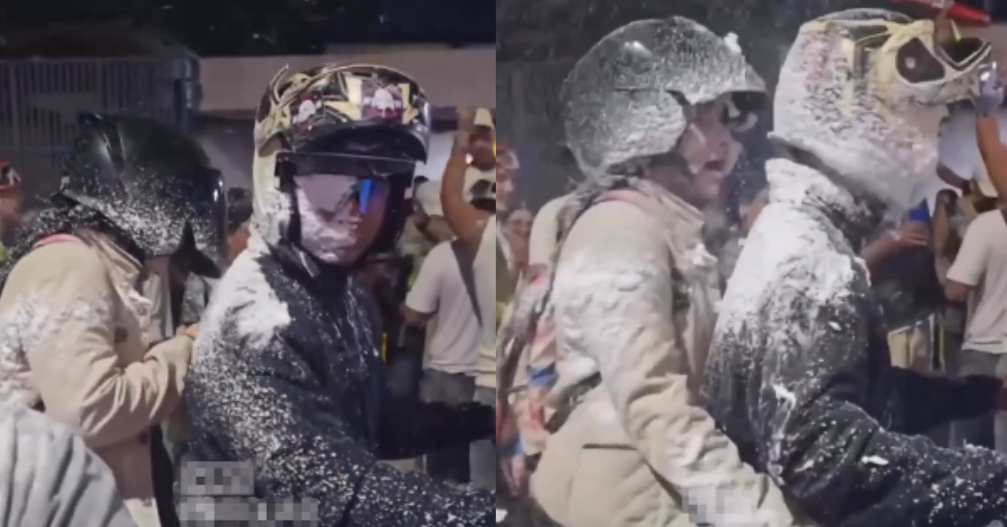 Um casal foi surpreendido ao tentar atravessar de motocicleta uma rua ocupada por um bloco de Carnaval e acabou atingido por espuma lançada por foliões.