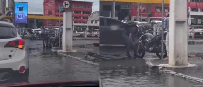 Em meio às dificuldades, algumas cenas chamam atenção pela solidariedade. Em um dos registros feitos por moradores, um motociclista aparece ajudando outro condutor a retirar a moto de um trecho alagado.