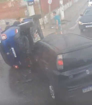Com a força do impacto, um dos carros acabou capotando no local, chamando a atenção de quem passava pela região.