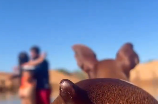 Enquanto o casal tentava gravar um registro afetuoso, o doguinho decidiu que ele é quem seria o verdadeiro protagonista. O pet roubou a cena de forma hilária, invadindo o enquadramento com uma energia e timing impecáveis.