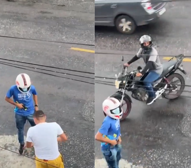 As imagens foram registradas por um morador da área, que preferiu não se identificar. No vídeo, é possível observar o momento em que a dupla aborda e assalta uma vítima na via.