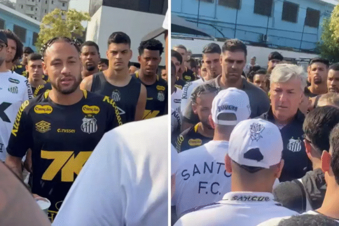 O atacante Neymar se reuniu com membros de uma torcida organizada do Santos que invadiu o CT Rei Pelé nesta terça-feira (19). O grupo chegou ao local com fogos de artifício e gritos de protesto contra a diretoria e os jogadores.