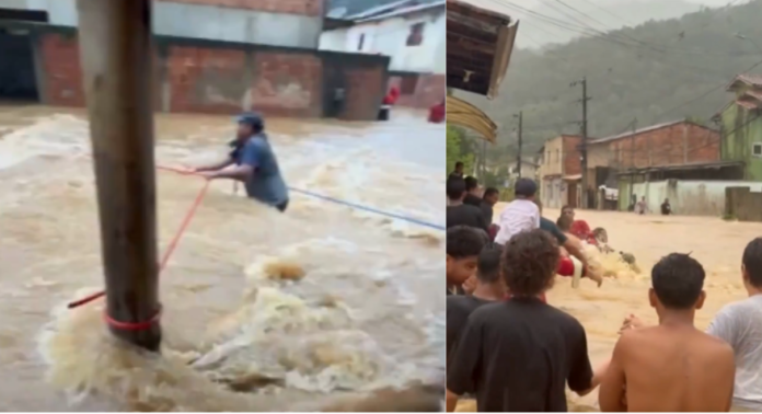 Em outra gravação, moradores se mobilizam para resgatar um homem que estava no meio da correnteza. Ele quase foi levado pela água, mas conseguiu ser retirado com a ajuda da comunidade.