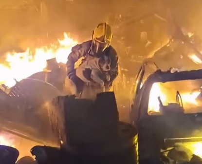 Vídeo: Entre chamas e fumaça, cadela é resgatada ilesa de oficina em chamas