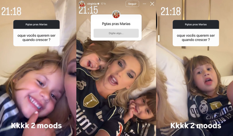 Virgínia, que acompanhou tudo de perto, não escondeu o orgulho e a diversão com as respostas. Ao compartilhar o vídeo nos Stories, ela legendou com um “Kkkk 2 moods” (dois estados de espírito), brincando com o fato de uma filha escolher uma profissão mais técnica e a outra o mundo do entretenimento.