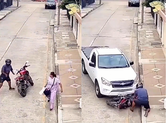 Câmeras de segurança registraram o momento em que um homem, após cometer um roubo contra uma mulher, foi atingido por um veículo que passava pelo local.