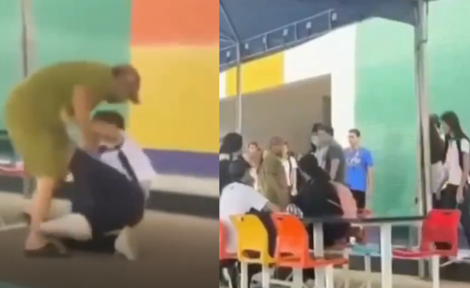 Nas gravações, é possível ver o momento em que o homem aborda e empurra o jovem no interior da escola. Segundo informações preliminares, ele seria pai de uma aluna.