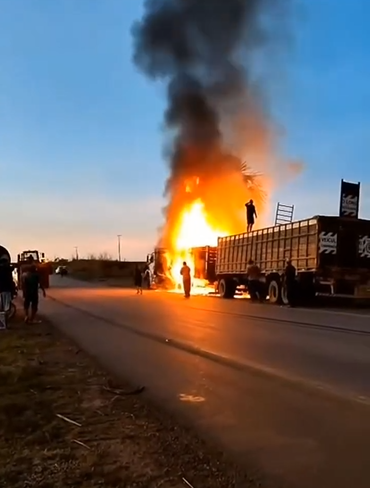O incêndio atingiu o veículo enquanto transportava gado, gerando momentos de tensão no local.