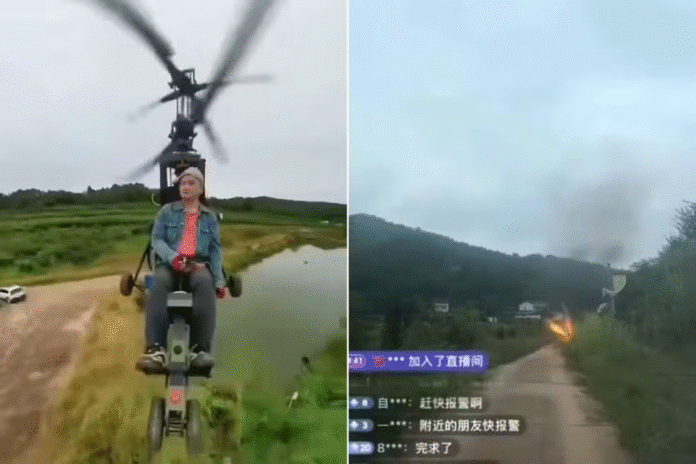 Vídeos que circularam na rede social mostram o momento em que Feiji decola no veículo aéreo de pequeno porte. A aeronave voa por um tempo, mas repentinamente cai no chão, explodindo em chamas.
