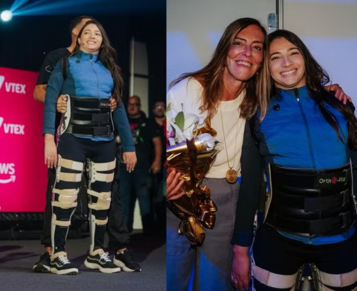 Utilizando o apoio de uma órtese tecnológica, Lais não apenas ficou de pé, mas entrou caminhando no palco. O gesto simbólico teve um propósito especial: entregar um prêmio à pesquisadora Tatiana Sampaio, que lidera estudos com a polilaminina, uma proteína que tem se mostrado promissora no tratamento de lesões na medula espinhal.