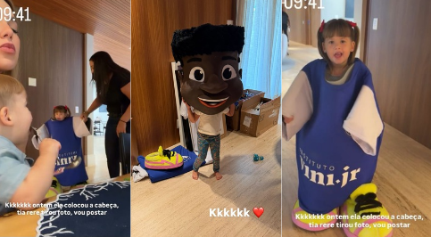 A menina surgiu com um traje completo no estilo “mascote”, incluindo uma cabeça personalizada, o que fez Virginia cair na risada imediatamente. A roupa gigante trazia a inscrição “Instituto Vini Jr.”, em referência à organização social fundada pelo jogador do Real Madrid. O atleta, que vive na Espanha, mantém um relacionamento com a influenciadora, que costuma viajar frequentemente para encontrá-lo.