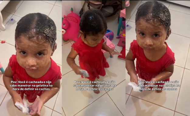 Aproveitando um momento de distração, a menina não só abriu o pote do produto, como resolveu fazer uma experiência química. Ela dissolveu a gelatina em água e, com uma dedicação impressionante, espalhou a mistura por toda a cabeça.