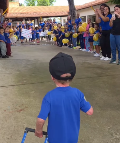 A criança passou por sete cirurgias e permaneceu 74 dias internado. O retorno à creche foi marcado por uma recepção emocionante organizada por colegas, professores e pela direção da unidade de ensino.