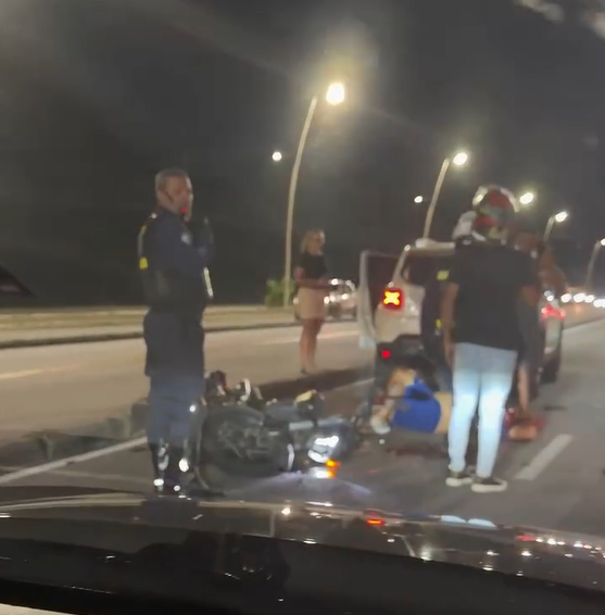 No momento do registro, o motociclista permanecia no chão aguardando atendimento de equipes de socorro especializado.