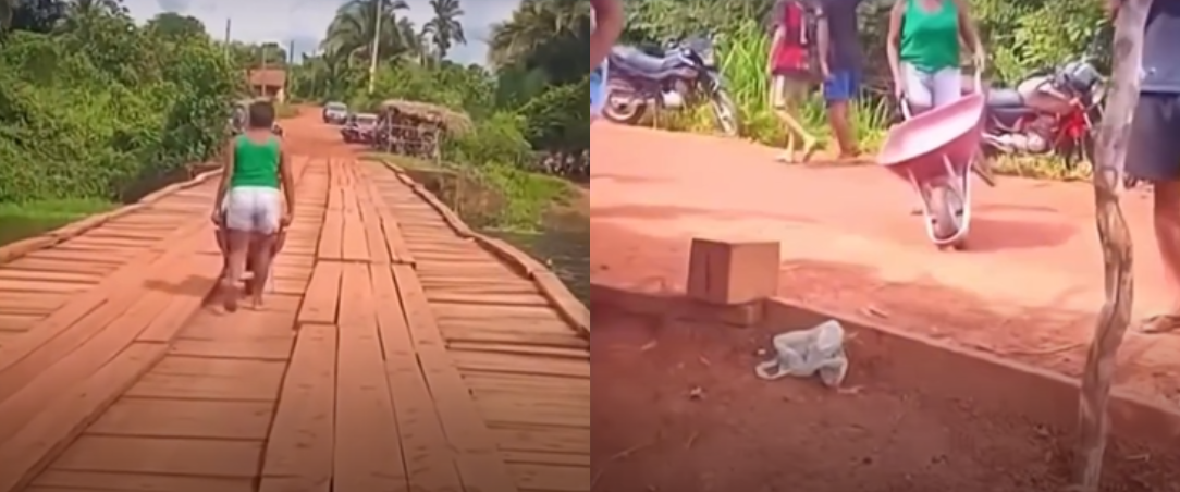Nas imagens, a mulher chega ao local em uma motocicleta levando um carrinho de mão para auxiliar no “resgate”. Com a ajuda de homens que estavam presentes, o marido é colocado dentro do equipamento.