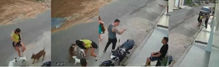 Câmeras de monitoramento da rua registraram o momento exato em que o pitbull avança contra o trio de animais. Após conseguir separar a briga entre os cães, a mulher iniciou uma discussão com o proprietário do pitbull, que culminou em uma agressão física contra ela.