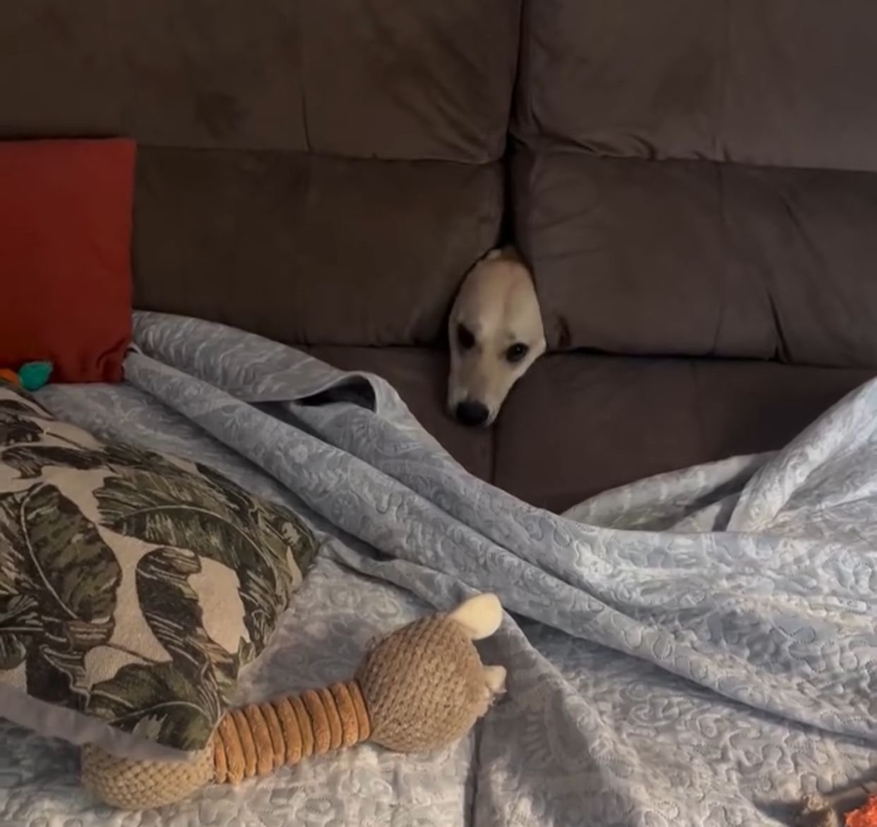 O pet encontrou uma brecha no forro ou na estrutura e decidiu que o estofado seria o seu novo bunker particular, transformando o móvel em uma espécie de toca VIP.
