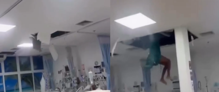 Imagens que circulam nas redes sociais mostram o momento em que o homem rompe o forro do teto e cai dentro da sala de internação. Após a queda, funcionários da unidade de saúde se aproximam e tentam conter o paciente.