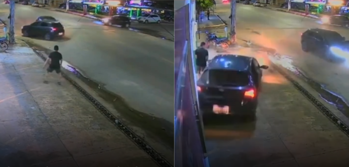 Imagens de câmeras de segurança mostram o momento em que o pedestre caminhava pela via e, ao perceber a colisão, consegue se afastar rapidamente, evitando ser atingido.
