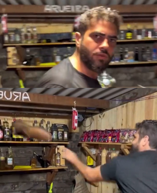 No registro, Henrique arremessa uma cadeira e, em seguida, joga suas próprias botas contra as garrafas de bebidas que decoram a prateleira do estabelecimento.