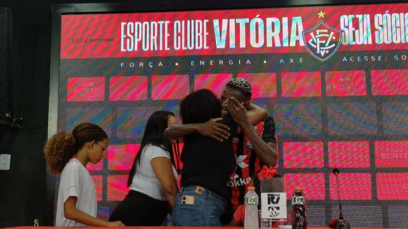 Em apresentação marcada pela emoção, atleta recorda trajetória de vida e dedica chegada ao clube baiano à memória da mãe.