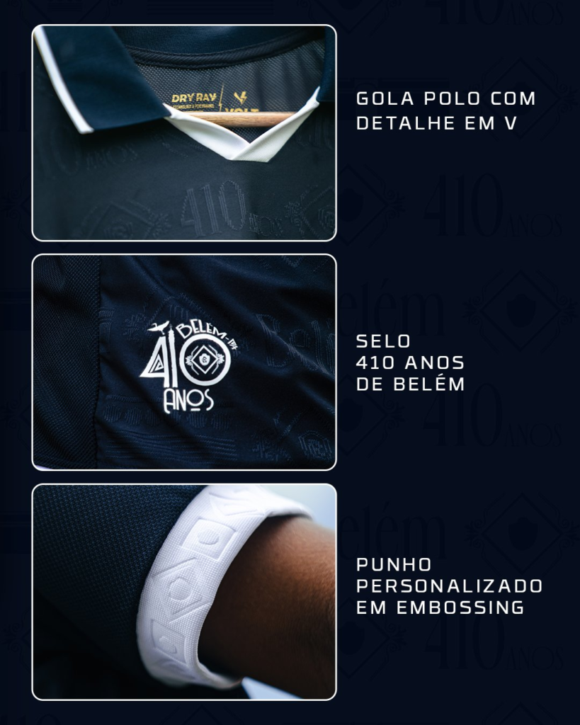 As mangas do novo manto também receberam atenção especial, apresentando acabamentos em branco e personalizações em embossing (relevo). Um dos diferenciais desta edição é a aplicação de um selo comemorativo em alusão ao aniversário de Belém. A tecnologia Dry Ray foi utilizada em toda a peça, que conta com estampas sutis do nome da cidade e a marca dos “410 anos” mescladas ao escudo remista.