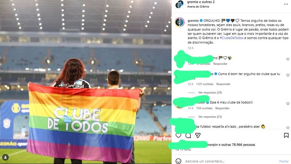 “ORGULHO! Temos orgulho de todos os nossos torcedores, sejam eles azuis, brancos, pretos, rosas ou de qualquer outra cor. O Grêmio é lugar de paixão, onde todos podem ser quem quiserem ser, lugar em que o mais importante é a voz do alento. O Grêmio é o clube de todos e somos contra qualquer tipo de discriminação”, diz o texto na íntegra.