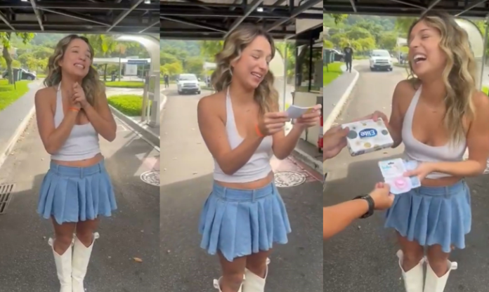 A ex-BBB Samira teve uma recepção, no mínimo, curiosa ao chegar aos Estúdios Globo nesta semana. À espera da ex-sister, um grupo de fãs decidiu inovar nos “presentes”, entregando itens que carregam um tom de puro deboche e bom humor: uma nota de 3 reais, uma chupeta e um pacote de lenços.