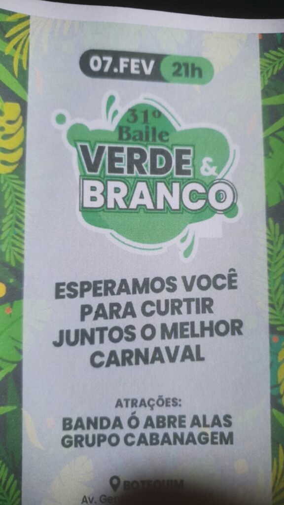 O Botequim, na Avenida Gentil Bittencourt, no bairro de São Brás, em Belém, abre as portas, neste sábado, 07, para a realização de um tradicional evento que ocorre sempre no Sábado Magro de Carnaval. Trata-se do 31º Baile Verde e Branco, um dos mais antigos programas carnavalescos realizados na capital paraense, promoção do Sindicato dos Profissionais de Saúde e Técnicos em Hospitais e Estabelecimentos de Saúde Privada do Pará – SINTHOSP.